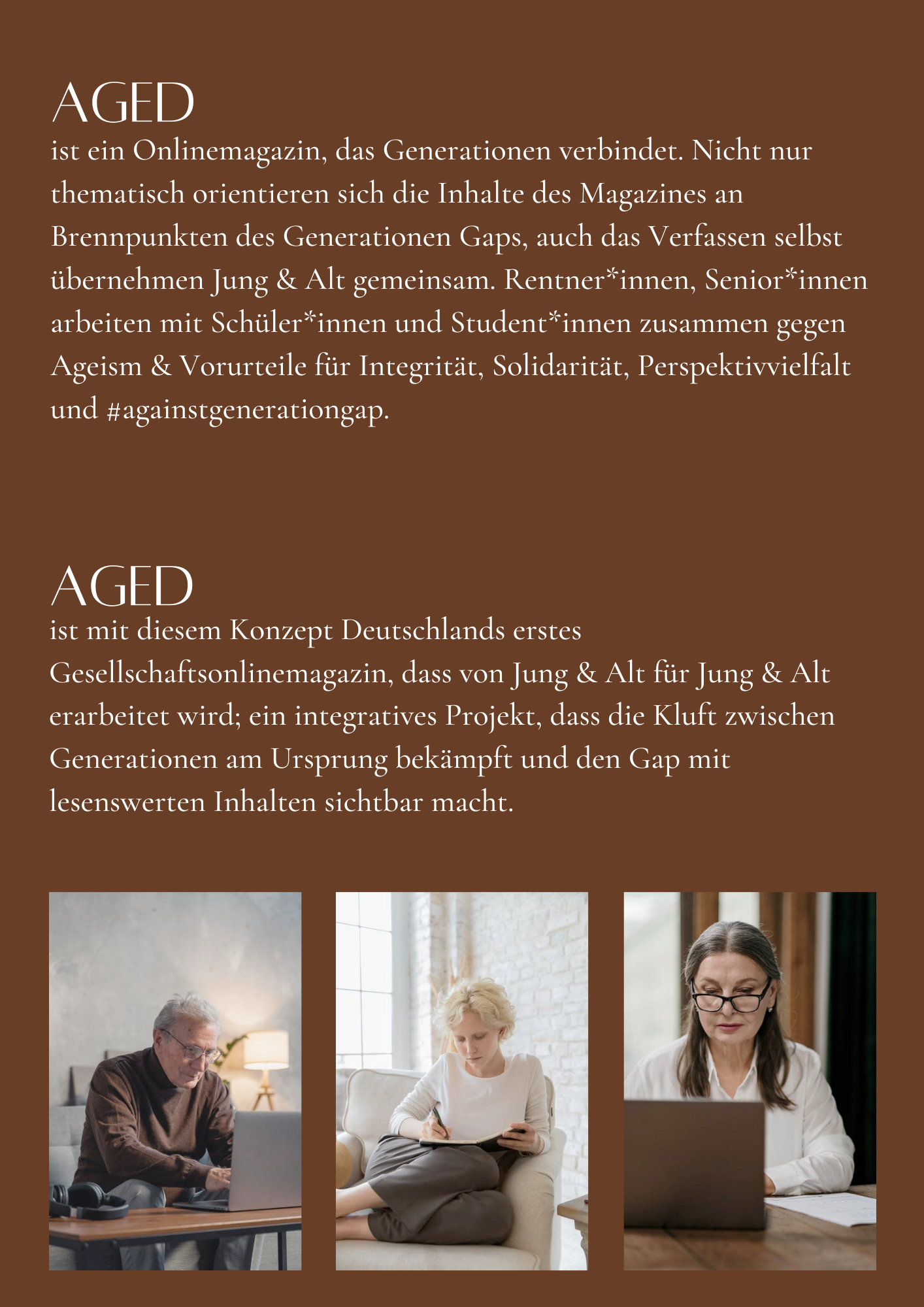AGED startete 2021 eine Crowdfundingkampagne. Mit einem übersichtlichen One-Pager zeigte ich die Gemeinsamkeiten zweier Generationen, die sich im Alltag zu selten begegnen. Der minimalistische Stil war mir für diese NGO besonders wichtig, um zum einen mit modernen Standards mithalten zu können und zum anderen attraktiv für die junge Zielgruppe dieses Projektes zu sein. Die Ansprache von zwei diversen Zielgruppen auf einer Website zu vereinen, war eine äußerst spannende Aufgabe.